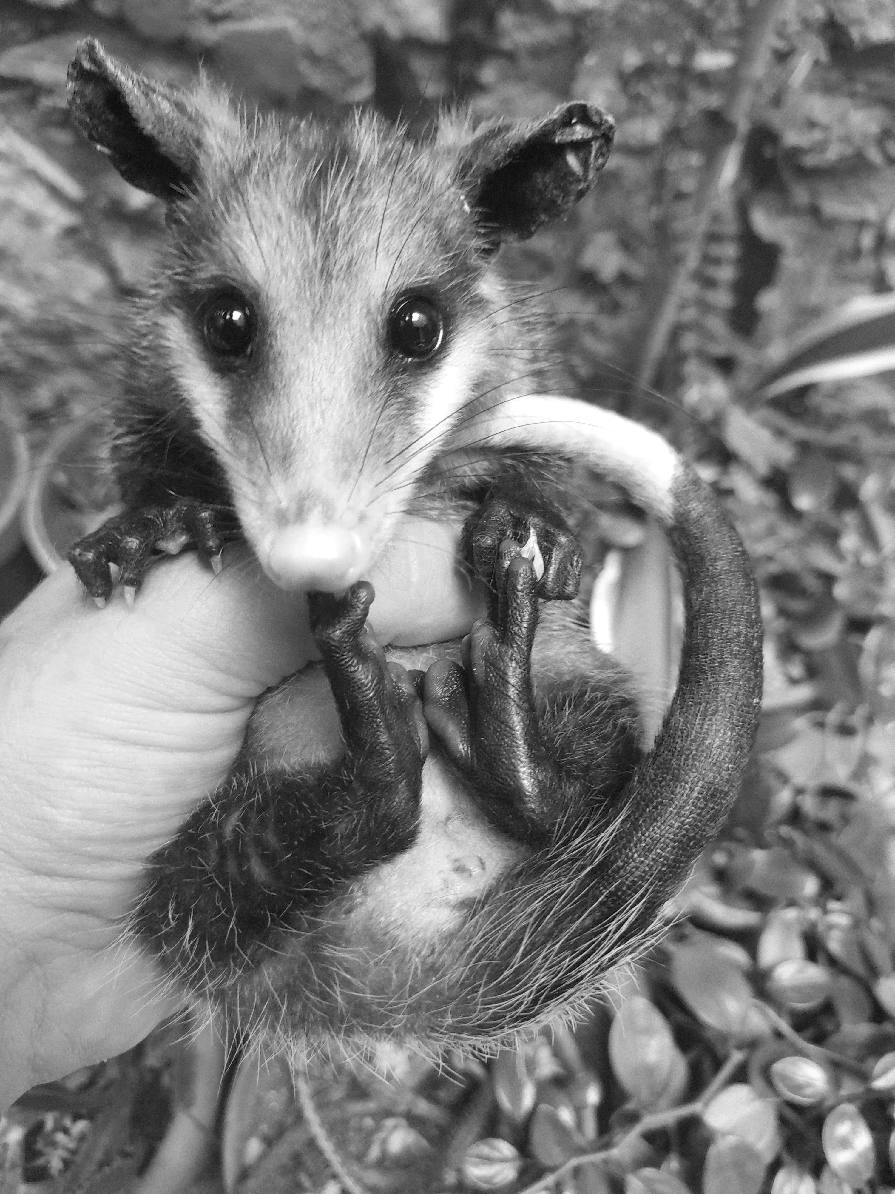 No pude resistirme a resolver el misterio, así que me puse a husmear entre las plantas y finalmente me encontré una especie de larva diminuta de ratón, del tamaño de un pulgar, sin ojos ni orejas, inmóvil sobre la tierra y cubierto de hormigas que parecían disponerse a devorarlo. Junto a él había otro ser igual también hormigueante, pero ya muerto y alimentando a las hormigas. Para que el sobreviviente no terminara como su hermano, me apresuré a rescatarlo, a sacudirle sus hormigas y a limpiarlo con el auxilio de mi compañera. No tardamos en identificarlo como una cría de tlacuache, zarigüeya, Didelphis marsupialis, el único marsupial de México.