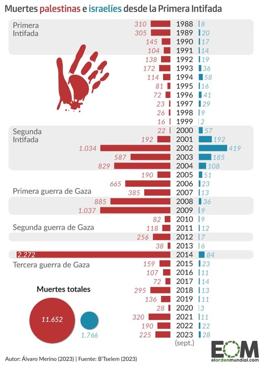 Si Hamas asesinó a 1200 personas en los ataques del 7 de octubre, ¿por qué el Ejército de Israel se ha permitido, como represalia, masacrar tranquilamente a más de trece mil civiles inocentes palestinos? ¿Por qué deben morir diez palestinos por cada israelí muerto? ¿Por qué una vida israelí vale 10 veces más que una palestina? ¿Quizás porque los palestinos son de tez más oscura? ¿Tal vez porque son más pobres tras haber sido empobrecidos precisamente por los israelíes que les robaron su riqueza, que los expulsaron de sus tierras y de sus casas, que les quitaron su agua, sus ovejas, sus olivos y naranjos?